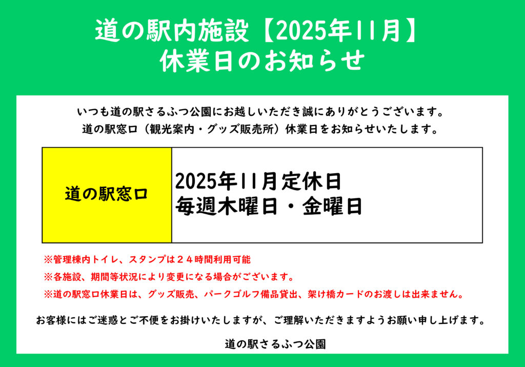 皆様、日頃より道の駅さるふつ公園をご利用いただき誠にありがとうございます。